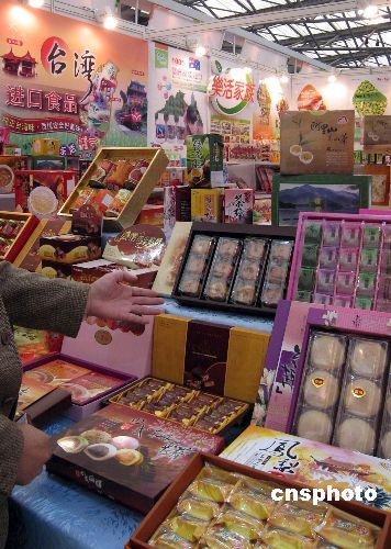 正在上海举办的中国大陆年度最大规模食品博览会(FHC)上,台湾食品行业的四十八家新老企业“组团”亮相,成为一道美丽风景。图为由大陆台商牵线,来自台湾北中南各地的百余种美食结成“联盟”,以“一站式”门店的模式,整体落户上海。中新社发 许晓青 摄