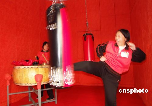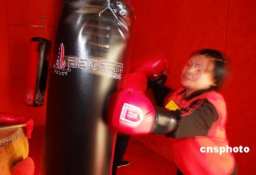 2007年11月14日,劳教人员在河南省女子劳教所的宣泄室内用力击打沙袋,宣泄心中的苦恼。宣泄室是该所劳教人员心理矫治中心新开设的心理治疗项目,室内的墙壁都用厚厚的海棉包裹,并配备了沙袋、锣鼓等供劳教人员使用,针对一些内向的学员,起到了很好地的心理治疗作用。据介绍,宣泄室只是心理治疗的一个环节,只有与其他的心理矫治手段相配合才能真正缓解劳教人员的心理压力,树立起重树新生的信心。中新社发 马健 摄