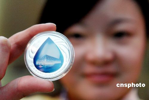 2007年11月16日,经北京奥组委授权,中国金币总公司近日起发行北京2008奥运会场馆纪念章。场馆纪念章主题图案采用了国家游泳中心——“水立方”为主要设计元素,并刊“第29届奥林匹克运动会场馆纪念”中英文字样,采用镜面、喷砂、高浮雕及彩色移印等造币工艺,充分展现了高科技含量的设计铸造技术。中新社发 马健 摄