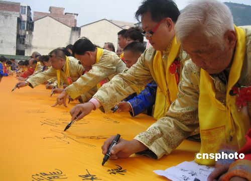 十一月二十四日,一百多位来自世界各国的华侨华人社团首领,在广东德庆县参加“拜谒龙母”寻根问祖活动。图为百名侨领书写“龙”字。中新社发 黄耀辉 摄