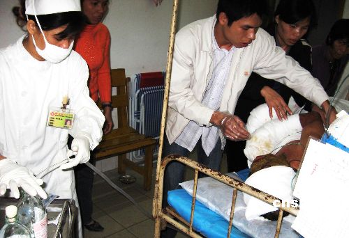 十一月二十四日,广西北海市合浦县一家据称未经当局批准开设的私营爆竹厂发生重大爆炸事故,目前已知至少有三人在是次事故中不幸罹难,另有十三人受伤,其中有多名伤员处于生命垂危状态。图为合浦县人民医院在紧急抢救伤员。中新社发 肖林 摄