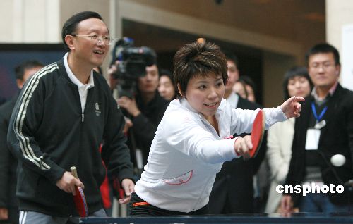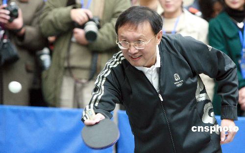 十一月二十五日,中国外交部在北京举行主题为“中国外交与北京奥运”的公众开放日活动。图为外交部长杨洁篪在“趣味乒乓赛”上一展身手。中新社发 廖文静 摄
