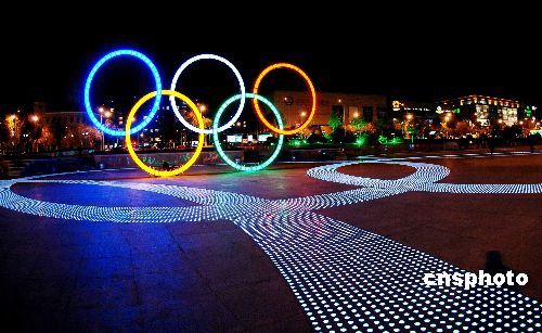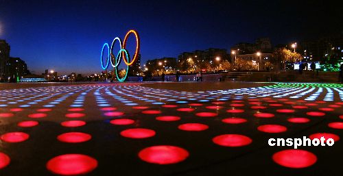 11月27日,大连市奥林匹克广场流光溢彩。日前,大连市利用高科技对奥林匹克广场地面进行了改造,在地面新建5个直径为38米,能变换多种色彩的奥运五环标志图案,成为大连市夜间格外壮观的一景。中新社发 刘德斌 摄