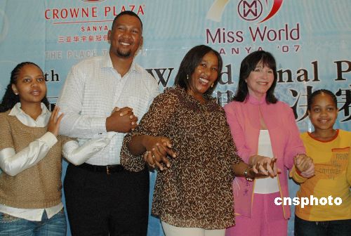十一月二十九日,海南三亚,南非前总统曼德拉的长女(中)长孙(左二)现身海南三亚,在世界小姐机构举行的新闻发布会(右二为世界小姐机构主席莫莉夫人)上呼吁更多的人关注艾滋病在全球的蔓延、关爱艾滋病患者。他们此行还带来了家乡的儿童合唱团,将于十二月一日晚举行的第五十七届世界小姐总决赛晚会上亮相。中新社发 尹海明 摄