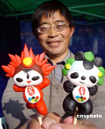 2007年12月5日,苏州面塑艺人吕树华用一双巧手捏出的奥运福娃造型面塑作品,形象逼真、可爱,表达了他对2008年奥运会的美好祝愿。中新社发 王建康 摄