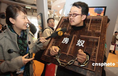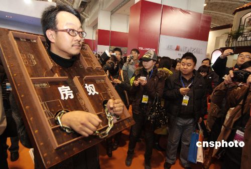 2007年12月11日,第九届中国住交会在北京开幕。行为艺术家梁克刚的头和双手被“房奴”的镣铐紧紧锁住,他频频到各大房地产开发商的展台“抗议”,表达自己的行为艺术。当行为艺术结束,打开“房奴”镣铐后,该行为艺术家终于露出笑容。中新社发 吴芒子 摄