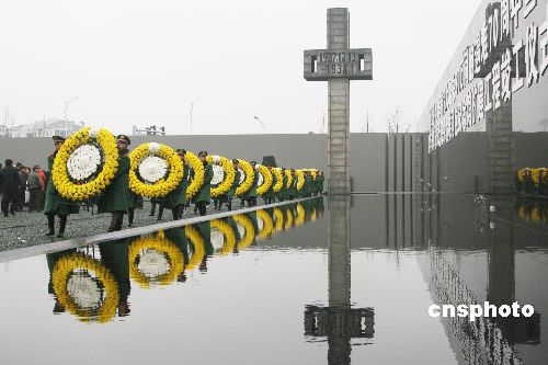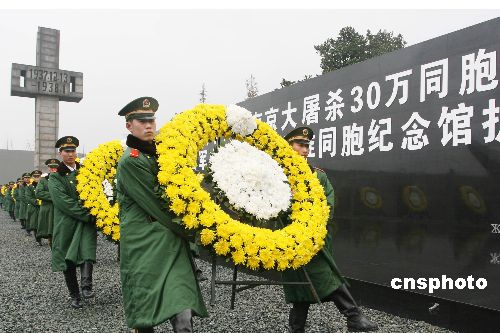 2007年12月12日,在侵华日军南京大屠杀遇难同胞纪念馆集会广场上,武警南京市支队国旗护卫队队员正在进行向南京大屠杀遇难同胞敬献花圈仪式排练。12月13日是南京大屠杀纪念日,南京市将在此举行悼念侵华日军南京大屠杀30万同胞遇难70周年纪念仪式暨侵华日军南京大屠杀遇难同胞纪念馆扩建工程竣工仪式。中新社发 韩华 摄