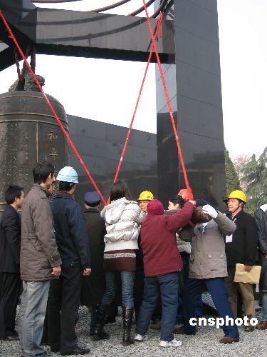 十二月十三日十时,江苏省各界人士八千多人在新落成的侵华日军南京大屠杀遇难同胞纪念馆新馆前的和平广场隆重举行“悼念侵华日军南京大屠杀三十万同胞遇难七十周年暨侵华日军南京大屠杀遇难同胞纪念馆扩建工程竣工仪式”。南京大屠杀幸存者代表、青少年代表、扩建工程建设者代表放飞和平鸽,并撞响了“和平大钟”。中新社发 朱晓颖 摄