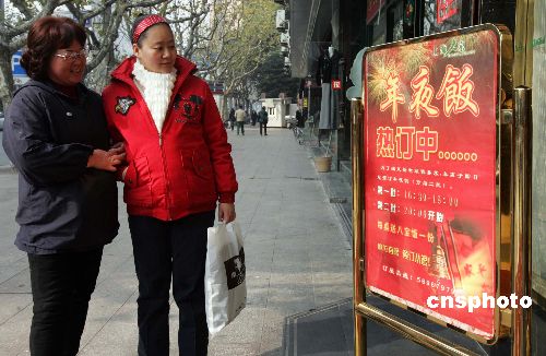 十二月中旬,上海“年夜饭”预定火爆,许多著名饭店、酒家预定爆满,留下的只有第二轮年夜饭。面对这种局面,许多家庭被迫改变计划改吃“年中饭”。中新社发 潘索菲 摄