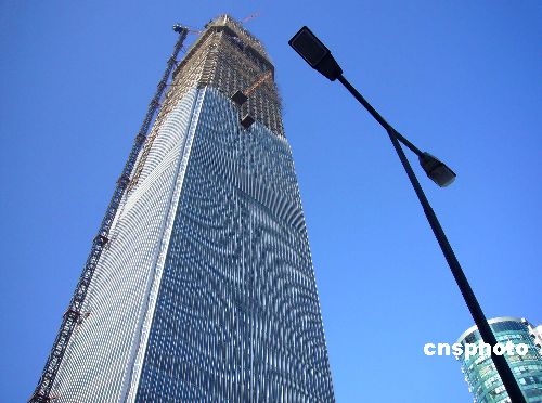 12月14日,北京中央商务区,330米高的国贸三期主塔楼环保玻璃幕墙已安装过半。据悉,这种幕墙每片玻璃翼上都有灯光效果,夜色降临后,幕墙上的灯光效果会拼出各种图案。届时,建成后的京城新地标将会在夜晚发出璀璨的光芒。中新社发 玉龙 摄