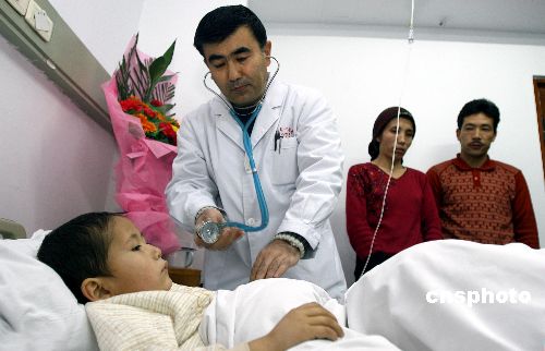 十二月十七日,新疆医科大学第一附属医院心脏外科的医生,正在为刚刚做完“心脏室间隔缺损修补术”的五岁维吾尔族小患者木尼尔丁进行常规术后检查。据介绍,木尼尔丁来自新疆沙雅县,患有先天性心脏病,由于家庭经济困难,一直未能手术治疗。本月中旬,木尼尔丁在新疆医科大学第一附属医院进行了“心脏室间隔缺损修补术”,目前病情恢复情况良好。