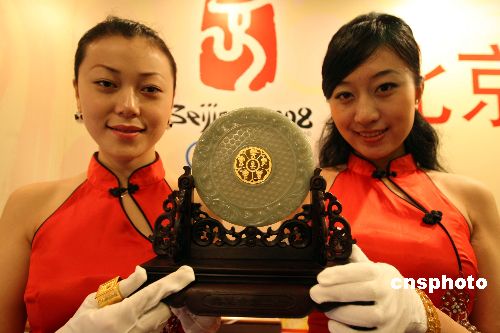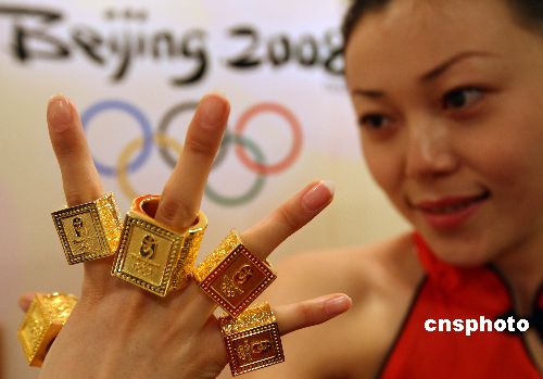 十二月十九日,由北京繁荣文化发展有限公司推出的五十余款奥运纪念章与消费者见面,此举使得北京奥运特许商品这一大家族又增添了“新成员”。这些限量发行的“新成员”,多为大众化商品,价格在一百元人民币的就有二十多种,内容涉及不同题材,如体育、科技、文化、城市等,其中最吸引人的还是设计制作独特的奥运金章玉璧等高端商品。中新社发 任海霞 摄