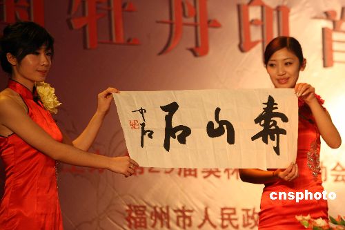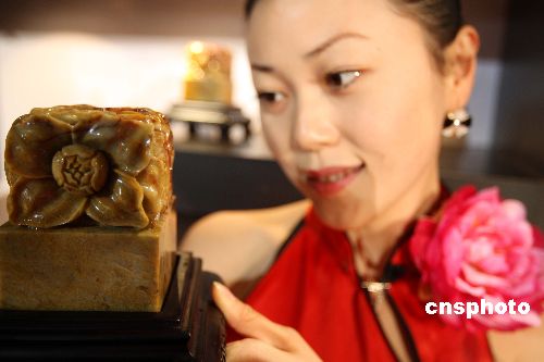 十二月二十日,北京奥组委在奥林匹克大家庭总部饭店北京饭店举行寿山石奥运特许商品“中国牡丹印”首发仪式。历史悠久、雕工精美的寿山石印,承载着“中国印·舞动的北京”与印钮部分国色天香、雍容华贵的牡丹交相辉映。此次隆重推出的“牡丹印”是寿山石奥运文化精品系列的首批代表作,限量2008枚。该印采用中华国石之首寿山石与国花牡丹相结合,选材为“中华印石三宝”的寿山芙蓉石脉,可称得上是精品中的精品。中新社发 任海霞 摄