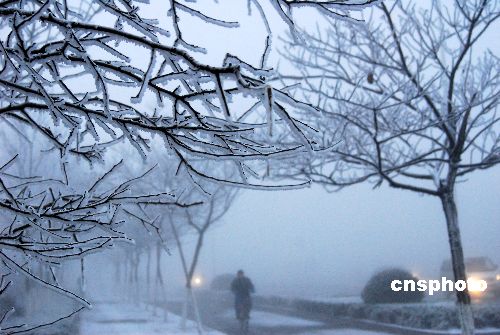 2007年12月21日,山东省烟台市开发区五指山路惊现雾凇奇观,路两侧的景观树上挂满厚厚白霜,晶莹剔透,吸引了众多市民和游客驻足拍照欣赏。据气象专家介绍,烟台市今冬一直较暖,遇见零下1摄氏度的气温,使弥漫于城中的茫茫白雾一夜之间凝成了冰晶,让人多年又见难得的“北国风光”。中新社发 申吉忠 摄