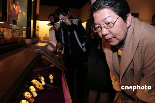 十二月二十三日,台湾著名女诗人、散文家、画家席慕容来到福建泉州中国闽台缘博物馆参观,当她看到两岸传统习俗和传统技艺展示时大为感动,像回到了童年时代。图为席慕容在木偶头像前驻足了许久。中新社发 傅丹丹 摄
