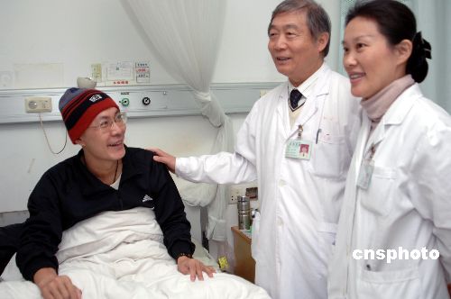 十二月二十四日,马上要出院的福建白血病患者赵伟,在协和医院与主治医师陈志哲(中)、付丹晖(右)轻松交谈。十月二十三日晚,一份从台湾慈济骨髓干细胞中心采集到的造血干细胞抵榕,成功植入患者赵伟体内。这是福建白血病患者成功与台湾捐赠者骨髓成功配对后,首次由台湾供者向福建患者捐赠造血干细胞。中新社发 王东明 摄