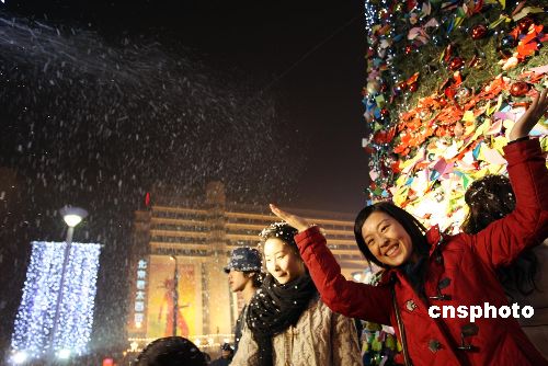 12月24日,北京西单街头的一棵许愿树前下起了“大雪”。这是商家为营造新年气氛,利用造雪机给人们带来的惊喜。不少年轻人一边感受“雪天”的浪漫,一边在贴纸上写下祝福的话语挂在许愿树上。中新社发 闻昭 摄