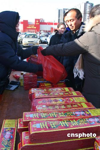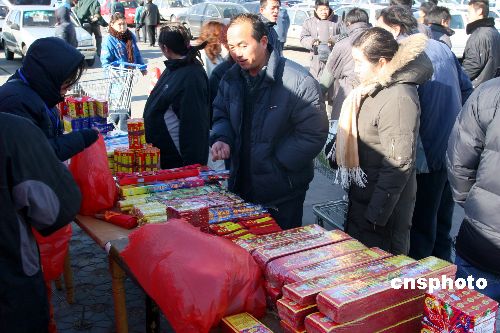 12月30日,北京市开始大规模向五环外沃尔玛等大型超市零售网点配送花炮,五环外的一些临时网点也挂上新颁发的许可证准备开业。元旦节前,市民可到五环外的这些零售网点购买花炮。中新社发 富田 摄