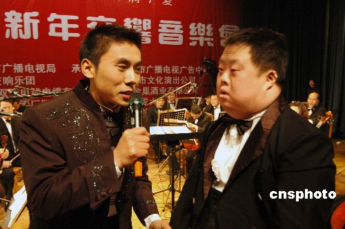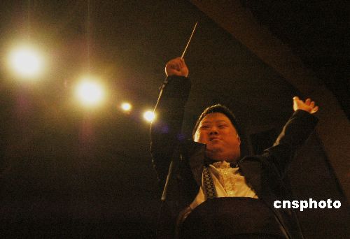 2008元旦之夜,《让世界充满爱》——“奇才指挥家”舟舟倾情指挥的大型新年交响音乐会在安徽巢湖举行。委婉动人的音乐令在场上千人领略了舟舟的指挥风采,感受了交响乐的魅力,给步入新年的巢湖市民带来了无数激情、梦想与欢乐。中新社发 徐振华 摄