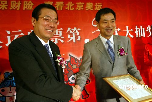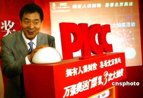 一月四日,著名表演艺术家濮存昕受邀为“拥有人保财险,喜看北京奥运——万张奥运门票大抽奖”活动进行第三次抽奖。在活动上,濮存昕被北京2008年奥运会保险合作伙伴中国人保财险聘为公司奥运形象大使。他高兴地表示,自己已经提出申请成为北京残奥会志愿者, 希望参与更多的社会公益事业。中新社发 杨可佳 摄