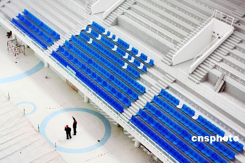 1月5日,北京国家游泳中心“水立方”,工作人员在加紧进行场馆周边的收尾工作。随着三项赛事组委会的正式成立,备受瞩目的国家游泳中心“水立方”本月底将迎来首场“好运北京”赛事,“好运北京”2008中国游泳公开赛、第16届国际泳联跳水世界杯赛、2008奥运会花样游泳资格赛从1月31日起陆续举行。中新社发 郑雄增 摄