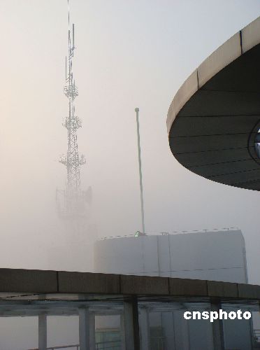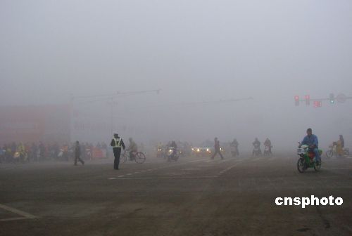 2008年1月7日,江苏连云港遭遇大雾天气,能见度不足50米,市民们谨慎出行。“三九”前夕,连云港最高温度达到12℃,一直保持升高回暖的态势,极易形成大雾天气。中新社发 耿玉和 摄