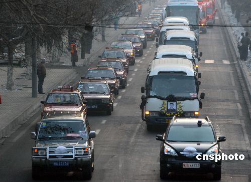 一月七日,新疆乌鲁木齐,三千余辆出租车自发组成车队浩浩荡荡为烈士送行。当日,在扑灭“1.2”乌鲁木齐德汇国际广场大火中牺牲的三位消防官兵追悼会在该市殡仪馆举行,新疆各界人士及三千余辆出租车、万余市民自发为三位烈士送别。中国公安部已批准壮烈牺牲的乌鲁木齐消防支队官兵朱晓雷、张宇、高峰三人为“革命烈士”。中新社发 刘新 摄