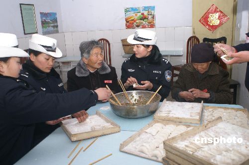 1月7日,河南商丘市公安交警火车站女子岗的女警们来到商丘市老年公寓,为“空巢”老人送去大米和水果。警花们还帮老人梳洗打扮、拆被洗衣、擦玻璃、清扫院子,与老人们一起包饺子,乐坏了公寓里的老人们。中新社发 白项林 摄