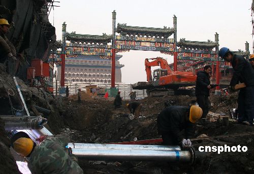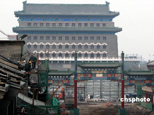 1月7日,北京前门步行街在寒冬中加紧施工。前门大街修缮整治后将恢复清末民初的建筑风貌,成为传统与现代相结合的步行街。位于前门大街正阳门前的五牌楼已基本完工,亮出真容。中新社发 富田 摄
