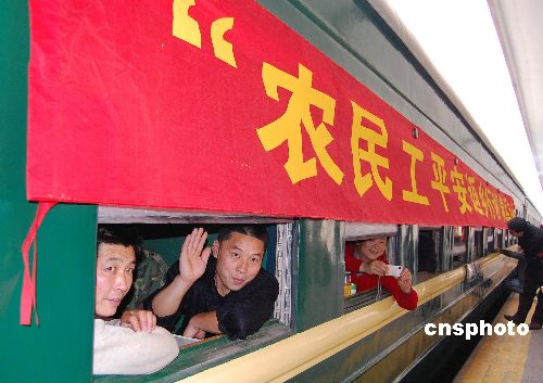 一月八日下午,广州火车站发出今春首趟珠三角农民工平安返乡专列,一千七百多名农民工乘专列途经广东、湖南、湖北、河南四省,开往河南省会城市郑州。中新社发 柯小军 摄