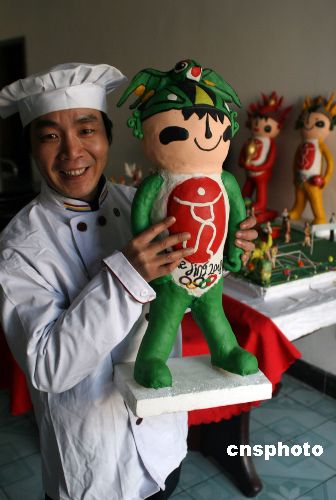元月8日,牛战红展示自制的奥运系列面塑作品。河南禹州市平禹煤电公司六矿职工食堂厨师牛战红,利用近两个月的工作之余制作了一套“全民健身迎奥运”面塑作品,大小面塑造型70多个,大的有60公分,小的5公分。牛战红表示,在奥运会结束后他还要将中国的奥运冠军做成面人造型。中新社发 万晓磊 摄