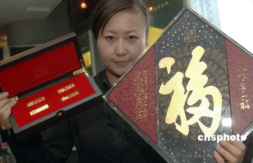 1月8日,由国道黄金发行的“中国纯金压岁钱”(礼盒)、 “中国春节金条”、“纯金天下第一福”等贵金属产品在北京上市。“中国春节金条”是一款春节气息浓郁的贺岁产品,包含4根20克的金条,以最具春节代表性的饺子、爆竹、年画、汤圆为主图案,传达这些春节元素的由来、历史故事。“纯金天下第一福”以清朝康熙皇帝于公元1673年为祖母孝庄太后“请福续寿”而书写的“福”字(被称为“天下第一福”)为主题,以纯金为材质。中新社发 邹宪 摄