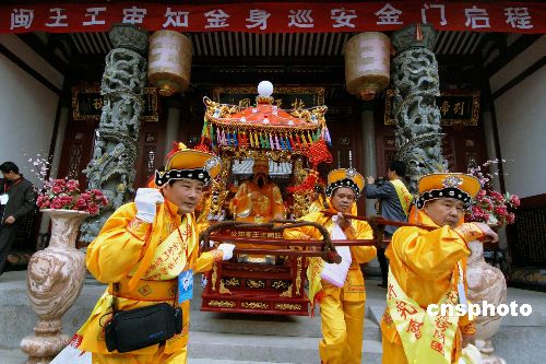 一月八日,福州市晋安闽台王审知研究会在福州莲花山闽王纪念馆举行仪式,欢送闽王金身首次巡安金门。九日上午,闽王金身将经厦金航线直航金门,进行为期四天的巡安活动。中新社发 王东明 摄