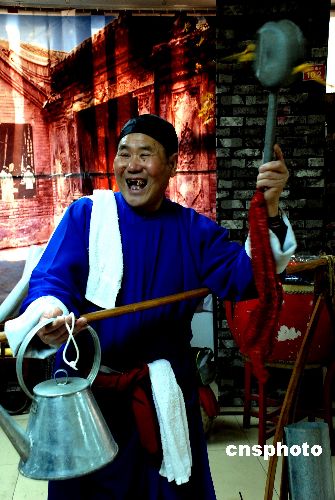 1月8日,老北京民间艺术团老艺人藏鸿在崇文区文化馆排演老北京叫卖艺术,为参加春节庙会做准备。“磨剪子,戗菜刀--”、“冰糖葫芦--”,这些老北京传统民间吆喝声,不仅仅是舞台上的一种艺术形式,近日已作为“老北京叫卖艺术”被北京市列入非物质文化遗产。中新社发 杨慧峰 摄