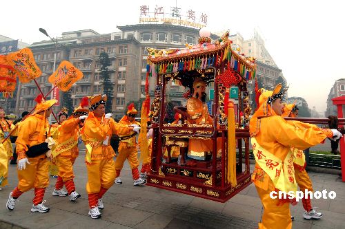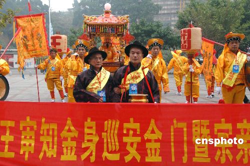 一月九日上午,闽王王审知金身在七十余位福州王氏宗亲文化交流访问团成员护送下,在厦门上船经“厦金”航线直航金门巡安,进行为期四天的交流活动。这是闽王金身首次赴金门巡安,期间福州与金门两地王氏宗亲将共同进行祭祖、学术交流等活动。中新社发 王东明 摄