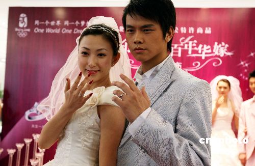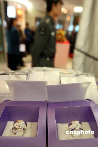 一月十一日,“相印五环 百年华嫁”奥运特许商品结婚钻饰新品在北京上市。这是第一款奥运婚庆主题概念的钻石类奥运特许商品,突破了贵金属特许商品市场只有收藏性纪念品的局限,创新性填补了市场空白。中新社发 任海霞 摄
