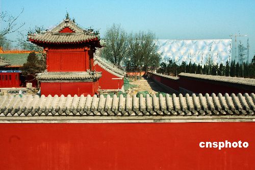 1月11日,为保持明代建筑风貌,曾迫使北京的国家游泳中心“水立方”施工位置北移的北顶娘娘庙,近日完成阶段性施工。位于“水立方”南侧的北顶娘娘庙为明代庙宇,是北京历史上著名的“五顶八庙”之一、北京城中轴北延长线上的一个标志性建筑。修缮一新的北顶娘娘庙红墙、琉璃瓦的古典味,与“水立方”的现代化遥遥相对形成强烈对比。中新社发 郑雄增 摄