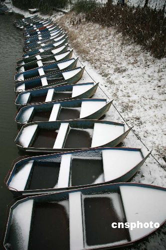 1月12日晚,江城武汉迎来2008年第一场雪,当晚,该市气象台发布道路结冰橙色预警信号。1月13日,武汉城区被积雪覆盖。中新社发 王振武 摄