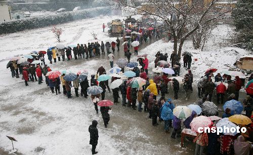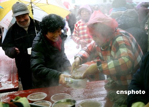 1月15日,南京市民排队领取毗卢寺派送的腊八粥。当日是中国传统的“腊八节”,民间有喝腊八粥的习俗,南京名刹毗卢寺免费向市民提供28888份腊八粥,吸引了众多市民排长队领取。据了解,毗卢寺当天免费提供的腊八粥,是由红豆、花生米等38种原料用微火熬制而成,其中仅糯米就有2888斤。中新社发 钟山 摄