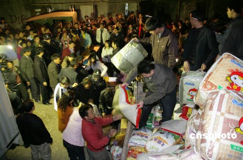 图为一月十四日晚,惠州市为灾民发放慰问品现场。一月十三日上午,在广东惠州市区河南岸街道办事处河南岸村渡船头村民小组面积过万平方米的一片棚屋发生火灾,造成三百多名来自河南、安徽等地的种菜和收废品的外来民工受灾。火灾发生后,惠州市委、市政府和惠城区委、区政府以及河南岸办事处立即妥善安置了灾民的生活。中新社发 宋秀杰 摄