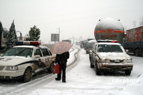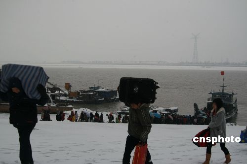 1月15日,赣北遭遇10年一遇的暴雪天气,江西九江市及8个县(市)发布暴雪蓝色预警及道路结冰黄色预警信号,因路面结冰,九江长江大桥、鄱阳湖大桥及所有高速公路全部封闭,交通安全及通行受到严重影响。中新社发 张 俊 摄