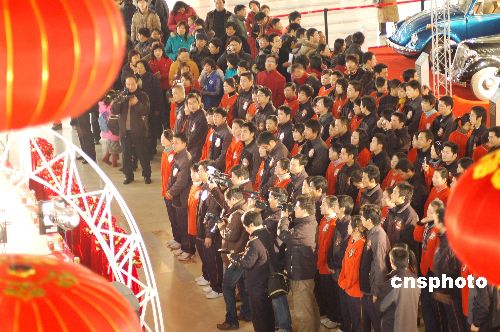 1月19日,江苏扬州市首届奥运风尚大典在扬州京华城举行,来自全省各地的52对新人参加了这场以奥运为主题的时尚集体婚礼。中新社发 张丙涛 摄