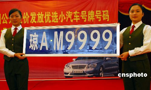 2008年1月18日,海南省第5期公开竞价发放优选小汽车号牌号码拍卖会在海口举行,150个吉祥汽车牌号参加竞拍, 琼AM9999以最高价10.2万元成交。此次拍卖活动的竞价方式为“公开叫价,价高者得”,是海南今年首场小汽车靓号竞拍会,旨在缓解九二式小汽车号牌优选号码的供需矛盾,满足群众的合理需求,促进廉政建设。中新社发 善平 摄