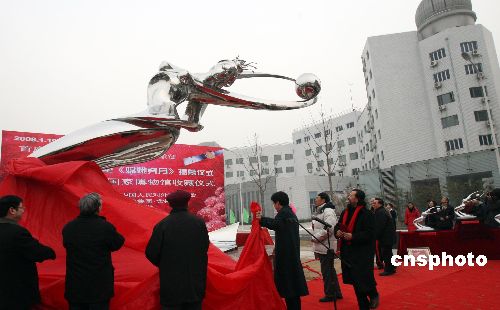 1月19日,中国科学院办公厅、中国国家博物馆、国家天文台在北京中国科学院奥运村科技园联合举行大型雕塑作品“嫦娥奔月”落成揭幕仪式,同时举行该作品由中国国家博物馆永久收藏仪式。雕塑“嫦娥奔月”由中国著名雕塑艺术家遥远先生创作完成,联手四川舍得酒业集团赠送中国科学院。中新社发 钱兴强 摄
