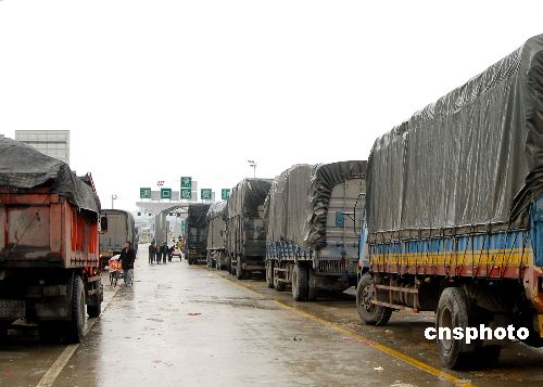 1月22日,在沪昆高速湖南邵阳怀化段洞口入口处,等待通行的车辆排起长龙。连日持续冰冻天气,导致沪昆高速邵阳至怀化段的桥梁、涵洞全部冰冻,车辆无法通行,造成公路封闭。有关部门正采取措施,疏导滞留车辆。中新社发 滕治中 摄