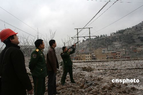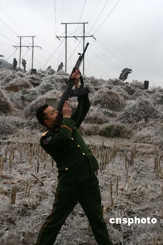 1月23日,在黔东南州凯里市,参与抢修的武警用冲锋枪击碎电线上厚厚的覆冰。受大面积冰冻灾害天气影响的贵州电网多处线路严重受损,至1月23日,黔东南苗族侗族自治州仍有7个县供电尚未恢复。目前,凯里电网2000多名职工组成的8支抢险突击队还在遭到停电的7个县一线进行昼夜抢修。中新社发 吴如雄 摄