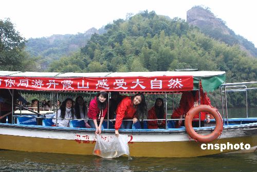 一月二十四日,新膺世界小姐中国姑娘张梓琳在世界地质公园广东丹霞山翔龙湖放生鲤鱼。是日,张梓琳在丹霞山践行她任期内的环保宣传。中新社发 冯昶 摄