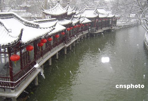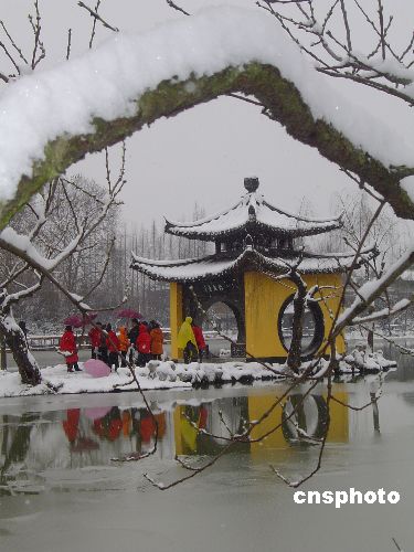 1月26日,雪中的扬州瘦西湖公园。1月25日夜,江苏再次迎来冬雪。据江苏省气象局分析,从1月25日夜到29日,江苏将出现持续性降雪天气,较大降雪出现在27日至28日,气温将持续偏低,并会出现冰冻。中新社发 施华健 摄