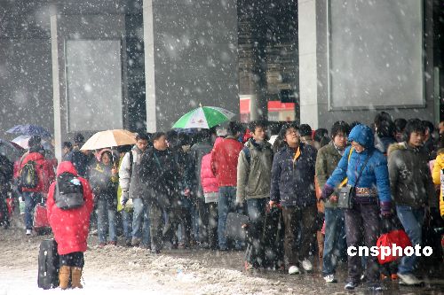 2008年1月26日,南京出现入冬以来最大幅度的降温和雨雪天气,受通往外地的高速公路全部关闭的影响,南京火车站迎来春运以来的最大客流量,前来购票的旅客一直排到站外广场,交警和武警官兵也协助车站方面维护秩序。中新社发 阿董 摄