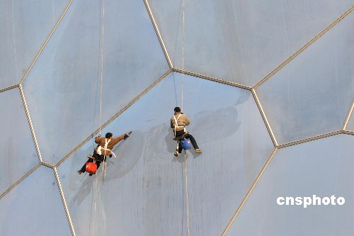 两名工人正在清洗北京奥运会游泳馆“水立方”的外墙膜。